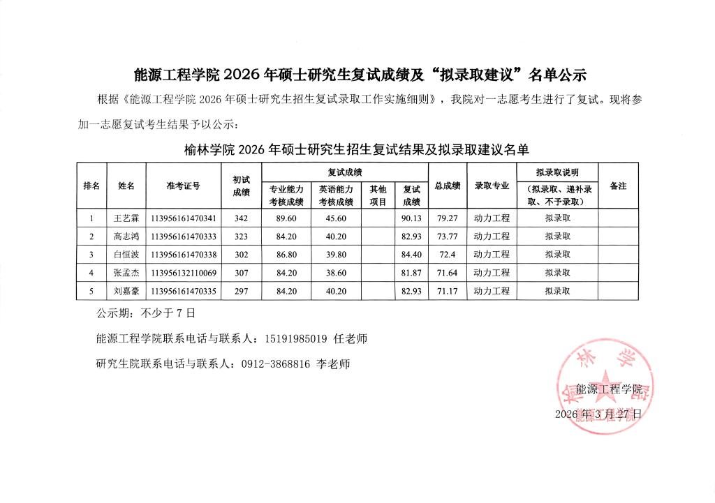 能源工程学院2026年硕士研究生复试成绩及“拟录取建议”名单公示